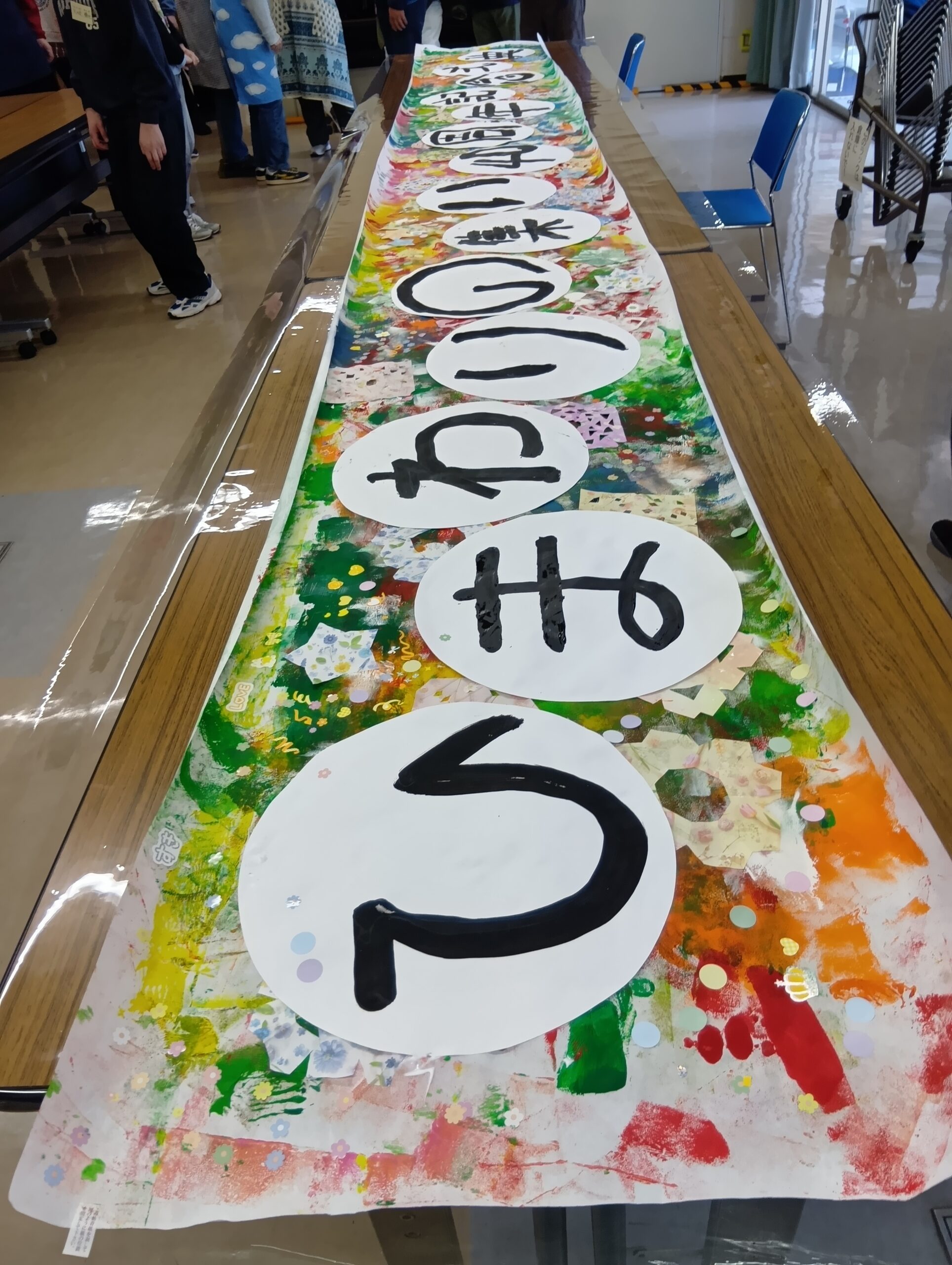 楽しく絵の具で文字を書いたり、看板を飾るバックに色塗りや色紙で作った