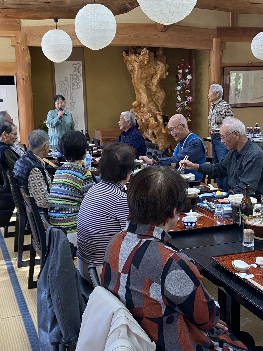 南ブロック交流会 報告 南ブロック 2025.11.10 11月7日、南ブロック交流会で東吉野の天好園に行きました。参加者19名のうち3名が他ブロックからの参加でした。食事は会席料理で鯉のあらいや猪鍋、イワナの塩焼きやフライなど東吉野ならではのメニューで田舎の秋を堪能させていただきました。 食後は西ブロックの西谷さんが吉野にちなんだ民謡を披露してくださったり、個性的な自己紹介を聞いたりして会が和みました。また、紅葉が進んでいるお庭や澄み切った綺麗な池で泳ぐ川魚にも心癒され楽しい1日になりました。南ブロック 柿坂嘉子