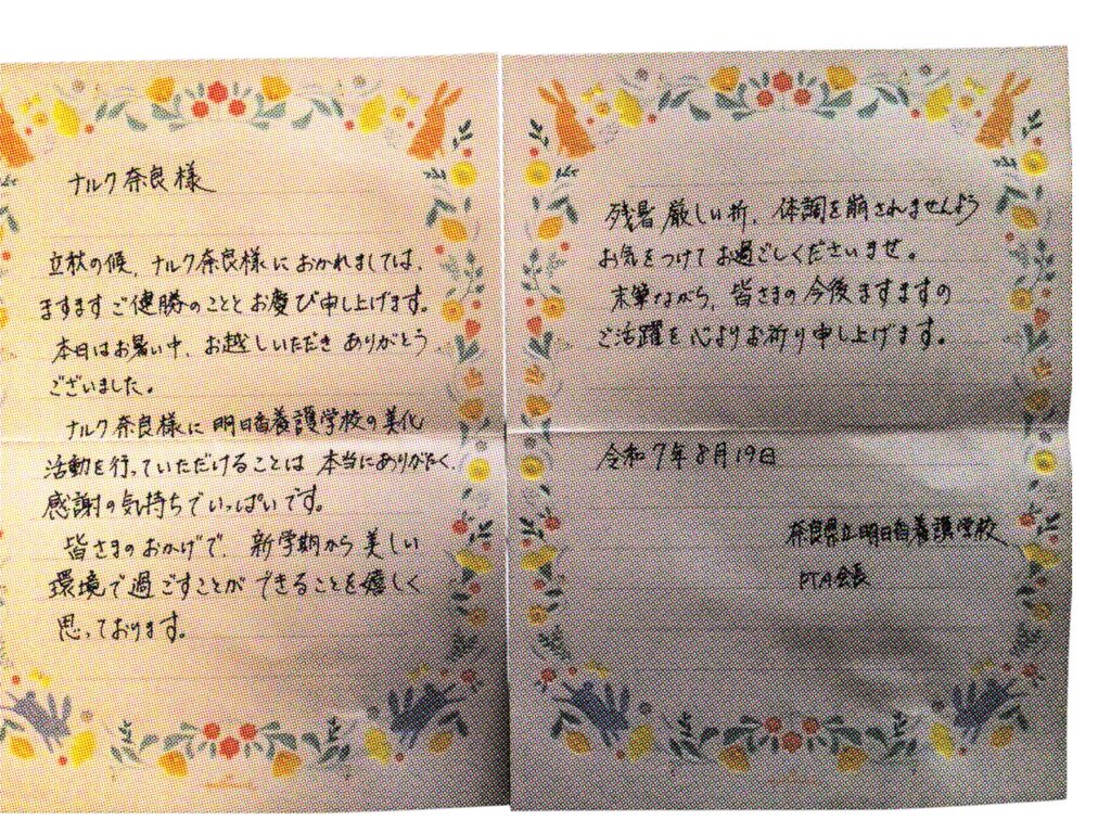 PTA会長様からお手紙を頂きました。