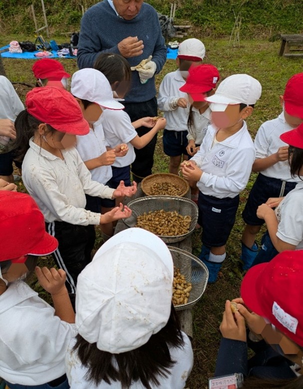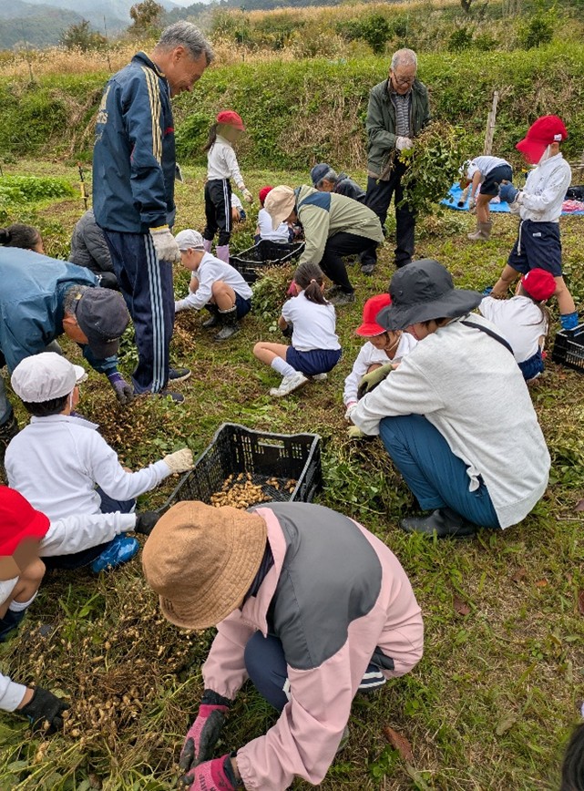 そのピーナツを地域の柳本小学校1年生の皆さんに、自然体験教室の一環として11月6日(木曜日)課外授業として「ピーナッツ掘り」体験学習として提供しました。